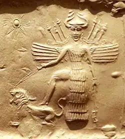 Deusa Inana num selo acadiano, 2 350-2 150 a.C. Ela está equipada com armas nas costas, tem um capacete com chifres e está pisando em um leão.