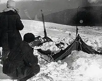 Em 26 de fevereiro, as equipes de busca encontraram o acampamento abandonado em Kholat Syakhl. A barraca estava arruinada, e um conjunto de pegadas seguiam até a margem de um bosque próximo, estando cobertas por neve após 500 metros. Na beira da floresta, sob um grande e antigo pinheiro, foram encontrados os restos de uma fogueira, juntamente com os primeiros dois corpos, descalços e usando apenas roupa de baixo. Entre o pinheiro e o acampamento estavam outros três corpos, mortos em posição que sugeria que estivessem tentando voltar às barracas. Eles foram encontrados separadamente, a distâncias de 300, 480 e 630 metros do pinheiro.[1] A busca pelos quatro esquiadores restantes levou mais de dois meses. Eles foram finalmente encontrados em 4 de maio, debaixo de quatro metros de neve, em uma ravina embrenhada na mata próxima ao pinheiro.