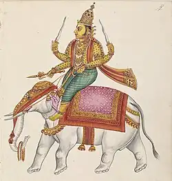 A iconografia de Indra o mostra em cima de seu elefante Airâvata, animal que na tradição hindu é associado a chuva e a prosperidade, além de possuir o relâmpago ou Vajra e espadas (esquerda). No Budismo e Jainismo, Indra mantém seu caráter de deus celeste e protetor do Darma, também é comumente mostrado sobre um elefante (direita). | ||