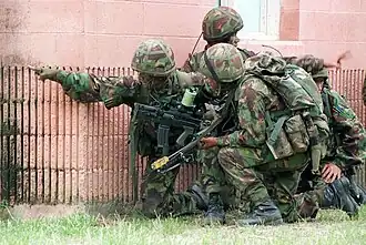 A infantaria, ao lado da cavalaria, formam as especializações de combate mais antigas do Exército e geralmente dotada dos maiores efetivos, formada por soldados que podem combater em todos os tipos de terreno e sob quaisquer condições meteorológicas, podendo utilizar variados meios de transporte para serem levados à frente de combate. Sua principal missão é conquistar e manter o terreno, aproveitando a capacidade de progredir em pequenas frações, de difícil detecção e grande mobilidade. A infantaria contemporânea frequentemente emprega o princípio de fogo e movimento para atingir uma posição dominante em relação àquela do inimigo.[1]