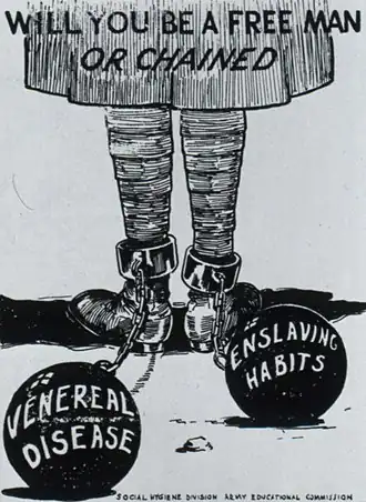 | Cartaz norte-americano de propaganda durante a Primeira Guerra Mundial, comparando doenças venéreas a grilhões. "Você será livre ou acorrentado" acima, "doenças venéreas" e "hábitos escravagistas" nos grilhões. | |