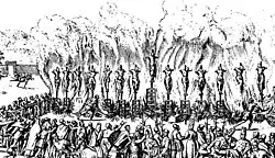 Massacre de valdenses em Piemonte em 1655 (gravura de 1658) A mulher torturada seria Anna Charboniere.[13]