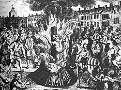 A execução na fogueira de Anneken Hendriks, uma neerlandesa anabatista do século XVI condenada por heresia.