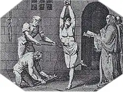 Dois sacerdotes demonstrando uma aplicação de tortura sob a supervisão da Inquisição.