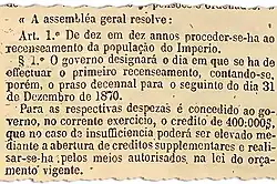 Projeto de lei aprovado pela Câmara e pelo Senado em 1870 determinado a realização do Censo.