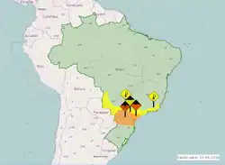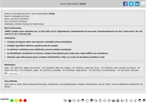 | Perigo Potencial | Situação meteorológica potencialmente perigosa. Cuidado na prática de atividades sujeitas a riscos de caráter meteorológico. Mantenha-se informado sobre as condições meteorológicas previstas e não corra risco desnecessário. | |