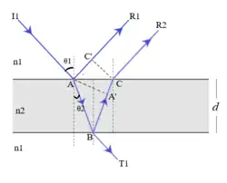 Dessa forma, I1 é parcialmente refletido, representado pelo raio R1, e parcialmente refratado até chegar ao ponto B, na borda inferior do filme. O raio que chega ao ponto B, novamente será parcialmente refletido, representado por R2, e parcialmente refratado (T1). Então, o raio R2 passa novamente por um processo parcial de refração e de reflexão ao atingir o ponto C, na borda superior do filme. Esse fenômeno acontece com todos os raios de luz que incidem sobre o filme fino.