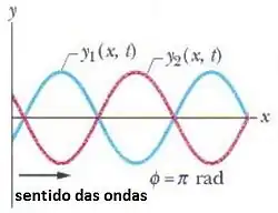 Representação de interferência entre duas ondas de mesma amplitude. No primeiro caso (esquerda) as ondas se encontram com uma diferença de fase ⲫ=0, causando uma interferência totalmente construtiva e resultando em uma onda com amplitude dobrada. No segundo caso (direita) as ondas se encontram com uma diferença de fase ⲫ= 𝜋 rad ou 180º, causando uma interferência destrutiva e a resultando em uma onda com amplitude zero.
