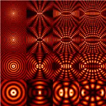 Uma fonte pontual produz uma onda esférica. Se a luz partir de duas fontes pontuais que se sobrepõem, a interferência padrão mapeia o caminho em que a diferença de fase entre as duas ondas varia no espaço. Isto depende do comprimento de onda e das distâncias relativas das fontes pontuais. A figura ao lado mostra a interferência entre duas ondas esféricas pontuais de diferentes comprimentos de onda e distância entre as fontes. Os aumentos de comprimento de onda de cima para baixo, e a distância entre as fontes da esquerda para a direita. Quando o plano de observação é suficientemente longe, o padrão de franjas serão uma série de linhas quase retas, uma vez que as ondas serão, então, quase planas.[1]