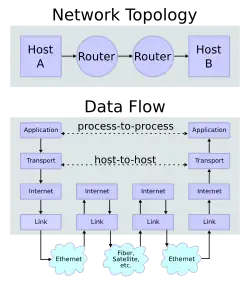 Fluxo de dados conceitual em uma topologia de rede simples de dois hosts (A e B) conectados por um link entre seus respectivos roteadores. O aplicativo em cada host executa operações de leitura e gravação como se os processos estivessem diretamente conectados entre si por algum tipo de canal de dados. Após o estabelecimento deste canal, a maioria dos detalhes da comunicação ficam ocultos de cada processo, pois os princípios subjacentes da comunicação são implementados nas camadas inferiores do protocolo