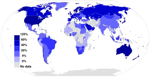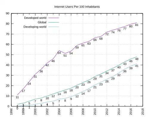 A União Internacional de Telecomunicações (UIT) estimou que, até ao final de 2017, 48% dos utilizadores individuais conectam-se regularmente à Internet, contra 34% em 2012.[55] A conectividade à Internet móvel tem desempenhado um papel importante na expansão do acesso nos últimos anos, especialmente na Ásia-Pacífico e África.[56] O número de assinaturas exclusivas de celular móvel aumentou de 3,9 bilhões em 2012 para 4,8 bilhões em 2016, dois terços da população mundial, com mais da metade das assinaturas localizadas na Ásia-Pacífico.[57] Em 2018, 80% da população mundial estava coberta por uma rede 4G.[57] Os limites que os utilizadores enfrentam no acesso à informação através de aplicações móveis coincidem com um processo mais amplo de fragmentação da Internet, que restringe o acesso aos conteúdos midiáticos e tende a afetar mais os utilizadores mais pobres.[56]