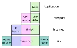 Abaixo desta camada superior, a camada de transporte conecta aplicações em diferentes hosts com um canal lógico através da rede. Ele fornece a esse serviço uma variedade de características possíveis, como Protocolo de Controle de Transmissão (TCP) e Protocolo de Datagrama do Usuário (UDP). Subjacentes a estas camadas estão as tecnologias de rede que interligam as redes nas suas fronteiras e trocam tráfego entre elas. A camada Internet implementa o Protocolo Internet (IP), que permite aos computadores identificarem-se e localizarem-se uns aos outros por endereço IP e encaminharem o seu tráfego através de redes intermediárias. Na parte inferior da arquitetura está a camada de enlace, que conecta nós no mesmo enlace físico e contém protocolos que não necessitam de roteadores para travessia para outros enlaces. O conjunto de protocolos não especifica explicitamente métodos de hardware para transferir bits ou protocolos para gerenciar tal hardware, mas pressupõe que a tecnologia apropriada esteja disponível. Exemplos dessa tecnologia incluem Wi-Fi, Ethernet e DSL.[62]