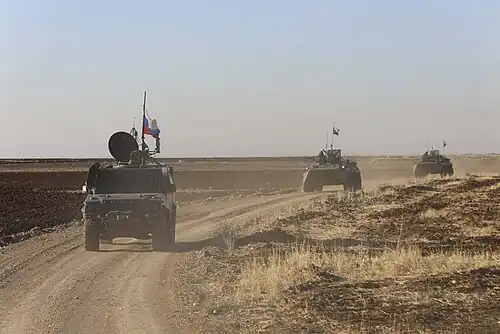 A intervenção russa na Guerra Civil Síria foi uma operação militar que começou em setembro de 2015 e perdurou até dezembro de 2024. Consistiu de uma série de ataques aéreos e navais feitos pelas forças armadas da Rússia contra o grupo extremista autoproclamado Estado Islâmico (EI) na Síria. Operações terrestres feitas por forças especiais russas, unidades de elite do exército russo e grupos mercenários como o ChVk Wagner também foram reportadas.[24] Os bombardeios e missões atingiram outras organizações não jihadistas que lutavam contra o regime do ditador sírio Bashar al-Assad. Antes da intervenção militar direta, os russos haviam se limitado a apoiar, monetariamente e em termos de armas, o exército sírio durante sua luta contra a oposição síria e outros grupos.[25]
