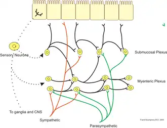 Na parede intestinal, encontra-se um sistema nervoso próprio do trato gastrointestinal com aproximadamente 100 milhões de neurônios. Ele efetua o controle dos movimentos e da secreção no local e é composto pelo plexo de Auerbach (ou plexo mioentérico) e pelo plexo de Meissner (ou plexo submucoso). O primeiro controla os movimentos gastrointestinais e o segundo as secreções e o fluxo de sangue na região.[12] Esse sistema pode funcionar independentemente de estímulos extrínsecos, porém está conectado aos sistemas simpático e parassimpático, capazes de aumentar ou inibir sua intensidade de ativação.[20]