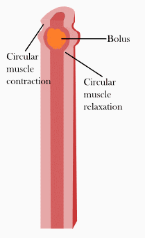 - Peristalse ou movimentos propulsivos: empurram o alimento através do tubo alimentar, permitindo a sua digestão e absorção adequadas. Um anel contrátil é formado na parede muscular do intestino e percorre o tubo, impulsionando o conteúdo à sua frente. Um dos principais estímulos que podem deflagrar os movimentos peristálticos é a distensão do órgão, que gera uma resposta do sistema nervoso entérico. A velocidade resultante do movimento peristáltico no intestino é de cerca de 1 cm/min.[16]