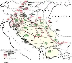 A Invasão da Iugoslávia, também conhecida como Guerra de Abril[9] ou Operação 25,[10] foi um ataque liderado pela Alemanha Nazista ao Reino da Iugoslávia pelas potências do Eixo que começou em 6 de abril de 1941 durante a Segunda Guerra Mundial. A ordem para a invasão foi apresentada na "Diretiva Führer No. 25", que Adolf Hitler emitiu em 27 de março de 1941, após um golpe de estado iugoslavo que derrubou o governo pró-Eixo.[11]