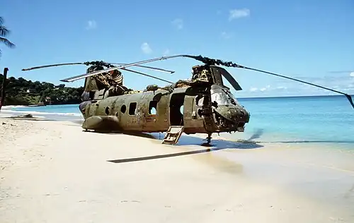 Granada: helicóptero norte-americano abandonado na praia, após a invasão.