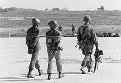 Dois prisioneiros granadinos do Exército Revolucionário Popular escoltados por um Ranger americano do 1/75 Rangers em Point Salines, durante a Operação Urgent Fury, em 28 de outubro de 1983. O militar que os escolta carrega um fuzil de assalto AK-47 de fabricação soviética apreendido (com coronha dobrável). As letras grandes destacadas nas pedras brancas da encosta dizem "Siempre es 26" ("Sempre é 26"), em homenagem ao aniversário da Revolução Cubana, em 26 de julho.