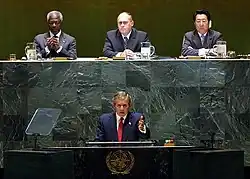 O então presidente americano George W. Bush falando no plenário da Assembleia Geral das Nações Unidas em 12 de setembro de 2002. No discurso ele falava sobre as queixas dos americanos sobre as atitudes do governo iraquiano
