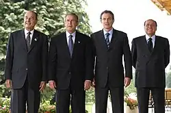 Os chefes de Estado das principais potências do G8 durante uma reunião na França. Da esquerda para a direita: o presidente francês Jacques Chirac, o americano George W. Bush e os primeiros ministros Tony Blair, do Reino Unido, e Silvio Berlusconi, da Itália. Deste, apenas Chirac não apoiou a invasão