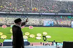 A Revolução de 1979, mais tarde conhecida como "Revolução Islâmica",[92][93] começou em janeiro de 1978 com as primeiras grandes manifestações contra o xá.[94] Após um ano de greves e manifestações paralisando o país e sua economia, Mohammad Reza Pahlavi fugiu para os Estados Unidos e Ruhollah Khomeini voltou do exílio para Teerã em fevereiro de 1979, formando um novo governo.[95] Depois de realizar um referendo, o Irã tornou-se oficialmente uma república islâmica em abril de 1979.[96] Um segundo referendo em dezembro de 1979 aprovou uma constituição teocrática.[97]