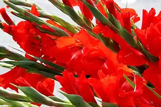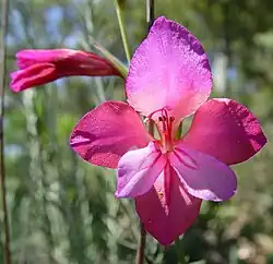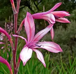 Watsonia pyramidata, com corola tubular.- Gladiolus illyricus, espécie europeia que apresenta flores zigomorfas.