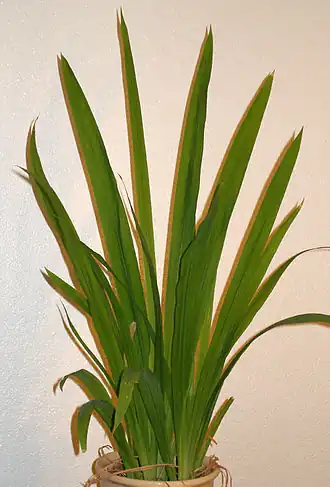 As folhas são alternas, dispostas em forma de leque, basais ou caulinares, com lâmina unifacial e nervação paralela. São geralmente ensiformes (em forma de espada) e morfológica e anatomicamente iguais na página superior e inferior (unifaciais). As folhas ligam-se ao caule por uma bainha, em geral aberta.