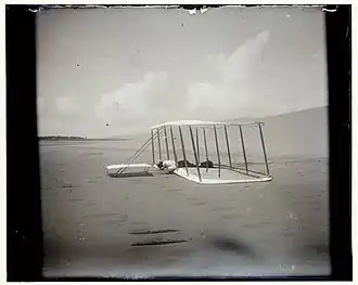 Já em campo, em Kill Devil Hills, depois de vários adiamentos por problemas técnicos diversos e uma diminuição do interesse dos repórteres, Wilbur ganhou no cara ou coroa e fez uma primeira tentativa de um voo de três segundos em 14 de dezembro de 1903, estolando logo depois da decolagem causando pequenos danos ao Flyer. Wilbur escreveu para sua família reportando a tentativa como um "sucesso parcial".[52] Depois dos reparos, os irmãos Wright finalmente decolaram em 17 de dezembro de 1903, fazendo dois voos cada um: o primeiro, pilotado por Orville as 10h35, percorreu 37 m em 12 segundos, a velocidade de 10,9 km/h.[34] Os dois próximos voos cobriram aproximadamente 53 e 61 m por Wilbur e Orville respectivamente. A altura foi de cerca de 3 m acima do solo.[53] O quarto voo pilotado por Wilbur já próximo ao meio dia, terminou num pequeno acidente depois de ter percorrido 259,69 m em 59 segundos. O leme frontal foi bastante danificado, mas a estrutura principal sofreu pouco. E a estimativa era de consertá-lo em um ou dois dias.[54]
