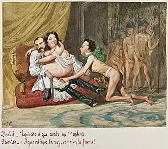 Los Borbones en pelota (Os Bourbons na punheta), aquarela satírica que ilustra os rumores da época acerca do casal real. A propaganda acusava Isabel, que tinha amantes, tais como Francisco Serrano y Domínguez, Manuel Antonio de Acuña, José María Ruiz de Arana, Enrique Puigmoltó and Carlos Marfori,[13] de ninfomania, atribuição que permanece no imaginário popular até os dias atuais.[14][15][16] Todavia, Isabel Burdiel, biógrafa de Isabel II, argumentou que tais acusações foram fabricadas por oponentes políticos da rainha e que o amancebamento de amantes era comum na realeza da época.[17]