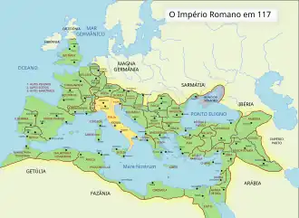 Mapa do Império Romano em 117 com a Itália em destaque.