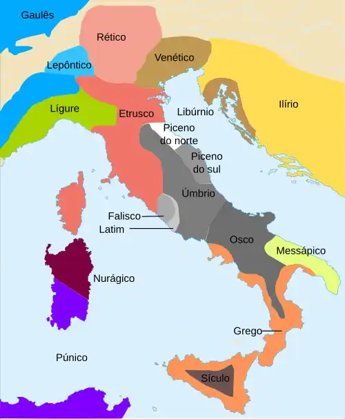 Outro povo que habitou a Itália foram os etruscos, que apareceram por volta de 750 a.C.. A sua origem continua um mistério: alguns acreditam que eram originários da Anatólia, mas ainda não há certeza quanto a isso. Os etruscos falavam uma língua não indo-europeia e que não tem nenhuma relação com nenhum outro idioma antigo à parte do rético dos Alpes e do lêmnio da região do mar Egeu. É provável que os etruscos vieram de algum lugar do Mediterrâneo Oriental e impuseram seu idioma sobre as tribos itálicas que viviam na Toscana e ao longo do rio Pó.[4]