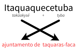 A rigor, o topônimo significa ajuntamento ou reunião de taquaras-faca (uma espécie de taboca ou taquara com cujos ramos, cortantes, se faziam facas), e é formado pela composição de takûara (taquara, taboca), kysé (faca) e tyba (ajuntamento, reunião, abundância), referindo-se a um imenso taquaral que existia na aldeia, no tempo de sua fundação, margeando os rios Tietê e Tipóia. O "i" parece que é uma prefixação arbitrária, isto é, não vem do tupi, e talvez tenha sido motivado pela grande quantidade de topônimos formados pela palavra pedra em tupi, que é itá. Em Itaquaquecetuba, passa a linha imaginária do Trópico de Capricórnio.[24]