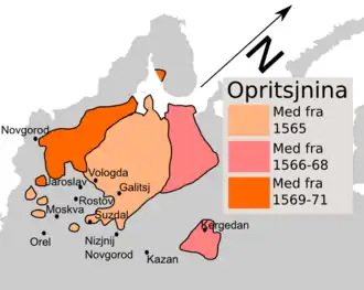 Território russo sob domínio da Opríchnina entre 1565 e 1572.