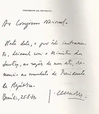 Na tarde de 25 de agosto, Jânio Quadros, para espanto de toda a nação, anunciou sua renúncia, que foi prontamente aceita pelo Congresso Nacional. Especula-se que talvez Jânio não esperasse que sua carta-renúncia fosse efetivamente entregue ao Congresso.[42] Pelo menos não a carta original, assinada, com valor de documento: