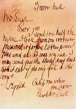 A carta "From Hell" foi recebida por George Lusk, líder do Comitê de Vigilância de Whitechapel, em 16 de outubro de 1888. O estilo de escrita não se assemelha a carta Dear Boss e o cartão-postal Saucy Jacky. A carta veio em uma pequena caixa de madeira onde Lusk descobriu a metade de um rim, preservado no "espírito do vinho" (etanol).[120] O rim esquerdo de Eddowes foi removido pelo assassino. A carta alegava que o signatário tinha "fritado e comido" a outra metade desaparecida do rim. Existe um debate sobre a natureza do órgão; alguns acreditam que pertence a Eddowes, e outros argumentam que não passa de alguma brincadeira macabra.[121][122] O rim foi examinado pelo Doutor Thomas Horrocks Openshaw do Royal London Hospital, que determinou que de fato era humano e pertencente ao lado esquerdo, mas (ao contrário do que as notícias jornalísticas alegaram) não pode concluir nenhuma outra característica biológica.[123] Mais tarde Openshaw também recebeu outra suposta carta escrita por Jack.[124]
