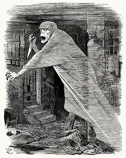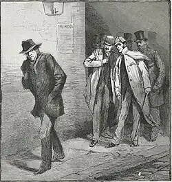 ![]() "Um possível suspeito", caricatura do The Illustrated London News publicada em 13 de outubro de 1888, retratando o Comitê de Vigilância de Whitechapel buscando Jack, o Estripador. | |