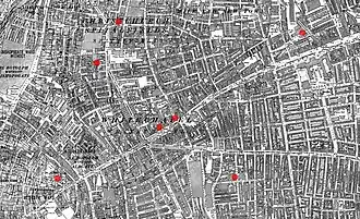 - ↑ Marriott, John, "The Imaginative Geography of the Whitechapel murders", em Werner, p. 54