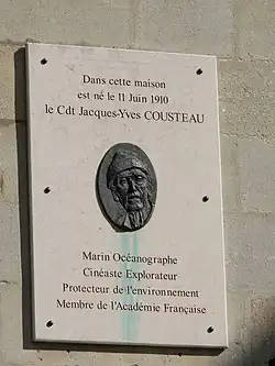 Placa comemorativa na residência de infância do comandante Cousteau, em Saint-André-de-Cubzac.
