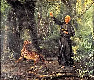 Foi retratada em pinturas do século XIX, como na pintura de Benedito Calixto, "Evangelho nas Selvas", em que é retratado o padre jesuíta José de Anchieta pregando o evangelho a uma jaguatirica. A obra foi inspirada no poema de Castro Alves "Os Jesuítas".[60] A escultura de Antoine-Louis Barye ilustra uma jaguatirica predando uma garça, uma obra intitulada Ocelot emportant un héron ("Jaguatirica carregando uma garça"), de cerca de 1850.[61]