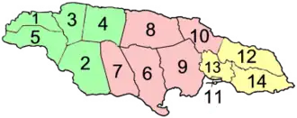 Administrativamente, a Jamaica está dividida em 14 paróquias (parishes). As paróquias estão agrupadas em 3 condados históricos, que não possuem relevância administrativa. Os condados com as respectivas capitais tradicionais entre parênteses: