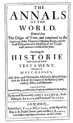 - ↑ James Ussher (1722). Annales Veteris et Novi Testamenti, a prima mundi origine deducti. Una cum rerum Asiaticarum et Aegyptiacarum chronico, a temporis historici principio usque ad extremum templi et reipublicæ Judaicæ excidium producto. Jacobo Usserio, Archiep. Armachano et Hiberniæ Primate; digestore. Accedunt tria ejusdem opuscola, 1. De chron (em latim). National Central Library of Rome. [S.l.]: apud Gabrielem de Tournes et fiios. Consultado em 29 de março de 2025