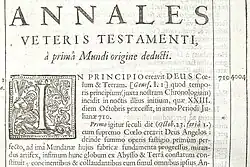 A principal obra de Ussher, os dois volumes de mais de mil páginas em latim Annales Veteris et Novi Testamenti,[6] foi publicada entre 1650-1654. Uma tradução em inglês intitulada The Annals of the World foi publicada pela primeira vez em 1658, dois anos após sua morte. Na época, a cronologia do arcebispo foi amplamente aceita, bem como ainda tem reconhecimento em círculos criacionistas que defendem uma Terra jovem.[7][8][9]