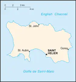 - ↑ Santo Helério é a capital de facto de Jersey, sendo a sede do governo da ilha, porém a Palácio do Governo, a residência real oficial da ilha, está localizada em Saint Saviour.