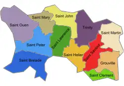 Administrativamente, Jersey está dividido em 12 freguesias. Todas têm acesso ao mar e tem nomes dos santos padroeiro das antigas paróquias: