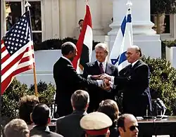 Desde o início de sua presidência, Carter tentou mediar o conflito árabe-israelense.[53] Após uma tentativa fracassada de buscar um acordo abrangente entre as duas nações em 1977 (através da reconvocação da Conferência de Genebra de 1973),[54] Carter convidou o presidente egípcio Anwar Sadat e o primeiro-ministro israelense Menachim Begin para Camp David, a residência de campo do presidente dos Estados Unidos, em setembro de 1978, na esperança de criar uma paz definitiva. Embora os dois lados não pudessem concordar com a retirada israelense da Cisjordânia, as negociações resultaram no reconhecimento formal de Israel pelo Egito e na criação de um governo eleito na Cisjordânia e em Gaza. Isso resultou nos Acordos de Camp David, que puseram fim à guerra formal entre Israel e Egito.[55]