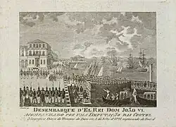Salvador passou um mês em comemorações pela presença da corte, e tentou seduzi-la a transformá-la em nova sede do reino, oferecendo-se até para construir um luxuoso palácio para abrigar a família real. Mas D. João, lembrando aos locais que anunciara a todas as nações sua intenção de fixar-se no Rio de Janeiro, declinou, e prosseguiu viagem. O navio que o levava entrou na Baía de Guanabara em 7 de março, onde encontrou-se com as infantas e os outros membros da comitiva, cujos navios haviam chegado antes. No dia 8, finalmente, toda a corte desembarcou, encontrando a cidade engalanada para recebê-la. Foram nove dias de celebrações ininterruptas.[35] Um conhecido cronista da época, o padre Perereca, testemunha ocular da chegada, ao mesmo tempo em que lamentava as notícias da invasão da Metrópole, já intuía o que significava a corte em solo brasileiro:
