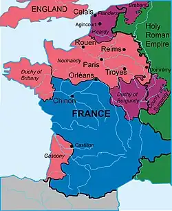 Henrique V da Inglaterra explorou as divisões internas da França ao invadir o país em 1415.[33] Os Borguinhões tomaram Paris em 1418.[34] Em 1419, o Delfim ofereceu uma trégua para negociar a paz com o Duque da Borgonha, mas o duque foi assassinado por partidários Armagnacs de Carlos durante as negociações. O novo duque da Borgonha, Filipe, o Bom, aliou-se aos ingleses.[35] Carlos VI acusou o Delfim de assassinar o Duque da Borgonha e declarou-o inapto para herdar o trono francês.[36] Durante um período de doença, a esposa de Carlos, Isabel da Baviera, assumiu seu lugar e assinou o Tratado de Troyes,[37] que deu sua filha Catarina de Valois em casamento a Henrique V, garantiu a sucessão do trono francês aos seus herdeiros e efetivamente deserdou o Delfim.[38] Isso gerou rumores de que o Delfim não era filho do rei Carlos VI, mas fruto de um caso adúltero entre Isabel e o duque de Orleães assassinado.[39] Em 1422, Henrique V e Carlos VI morreram com dois meses de diferença; o recém-nascido Henrique VI da Inglaterra era o herdeiro nominal da dupla monarquia anglo-francesa conforme acordado no tratado, mas o Delfim continuava a reivindicar o trono francês.[40]