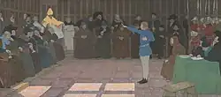 O veredicto já estava definido antes mesmo do julgamento começar.[211] A culpa de Joana poderia ser usada para comprometer as reivindicações de legitimidade de Carlos, mostrando que ele havia sido consagrado pelo ato de uma herege.[212] Cauchon atuou como juiz ordinário do julgamento.[213] Os ingleses financiaram o julgamento,[214] incluindo pagamentos a Cauchon[215] e a Jean Le Maître,[216] que representava o Inquisidor da França.[217] Dos 131 clérigos que participaram do julgamento, apenas oito não eram franceses[218] e dois terços eram associados à Universidade de Paris,[219] mas a maioria era pró-borguinhões e pró-ingleses.[220]