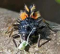 Larva típica de joaninha, alongada e com pequenos "espinhos". Da espécie Harmonia axyridis