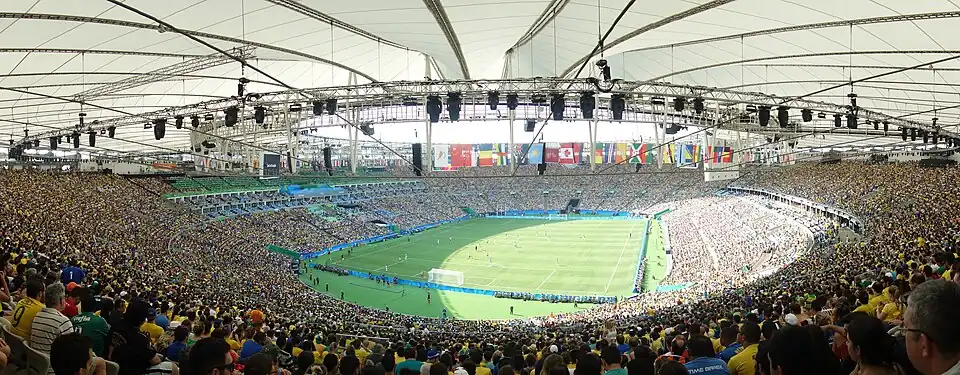 O maior espaço para os jogos em termos de capacidade é o Estádio do Maracanã, oficialmente conhecido como Estádio Jornalista Mário Filho, que pode abrigar 90 mil espectadores, sendo a sede das cerimônias de abertura e encerramento do evento, bem como de quatro jogos de futebol. Além disso, cinco locais fora do Rio de Janeiro foram sedes de eventos do futebol, nas cidades de Brasília, Belo Horizonte, Manaus, Salvador e São Paulo.[38]